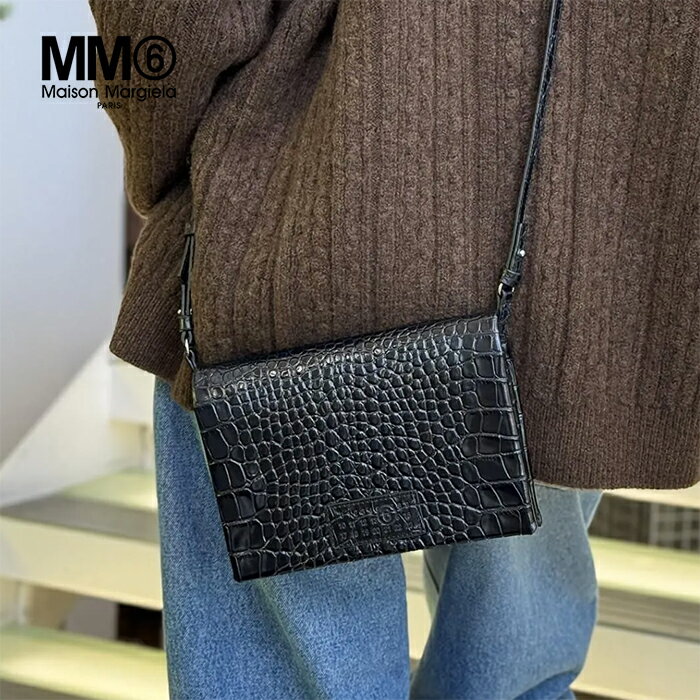 エムエム6 メゾンマルジェラ クロコ型押し クロスボディバッグ MM6 Maison Margiela ショルダーバッグ レザーバッグ カーフレザー 肩掛け 斜め掛け ブラック【2025秋冬】