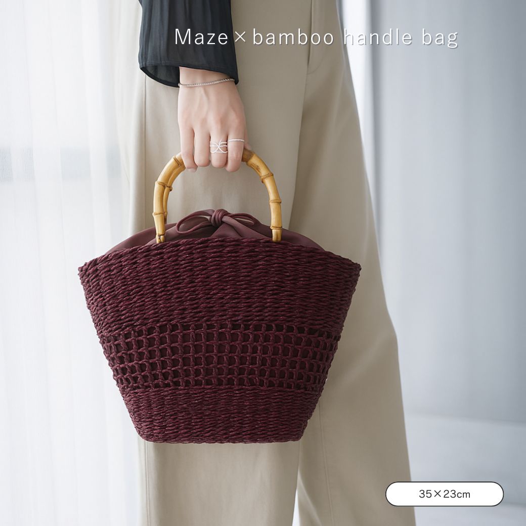 コーディネイトのポイントになる竹を使用したハンドルに、 本体にメイズ(とうもろこしの皮)をねじって丁寧に編みこんだバッグ。 巾着仕様で中身が見えないのも安心です。