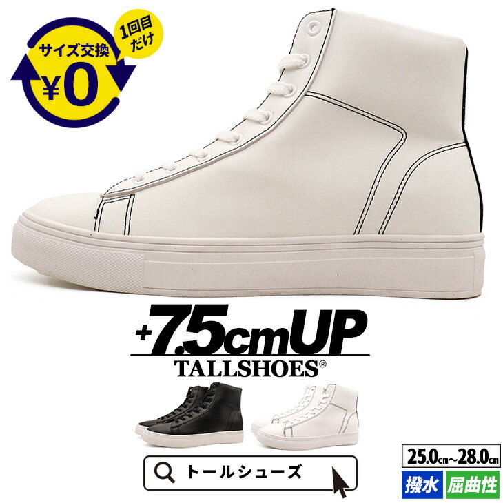 送料無料|TALLSHOES(トールシューズ)7.5cmUPハイカットスニーカー。サイドジッパー付きで着脱ラク。撥水×屈曲性で快適な履き心地。ブラック・ホワイト展開。モードにも映える