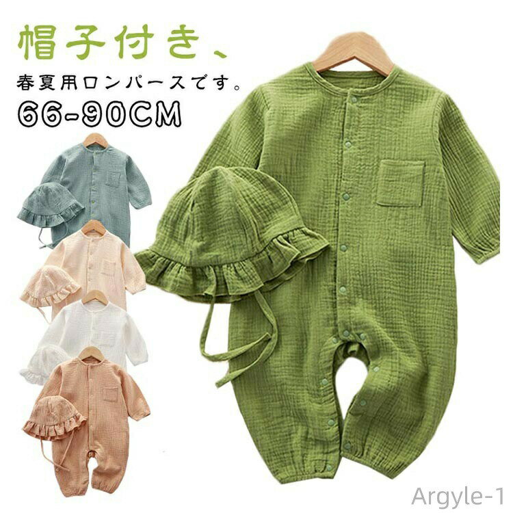 送料無料 ロンパース 前開き ハット付き 長袖 綿 ガーゼ綿 男の