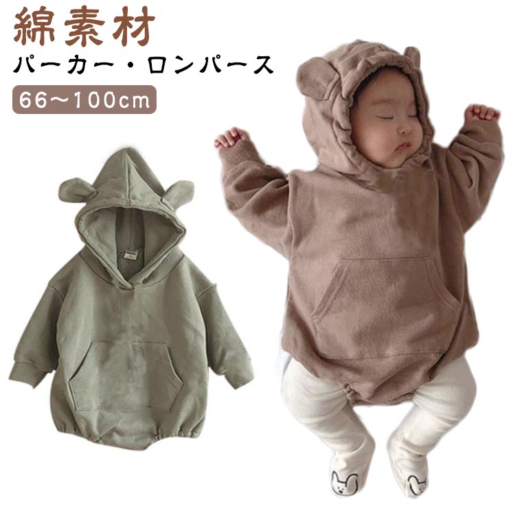 暖かく快適な裏起毛フリース素材で新生児から使える男女兼用の耳付き帽子付きロンパース厚手あったかベビー服