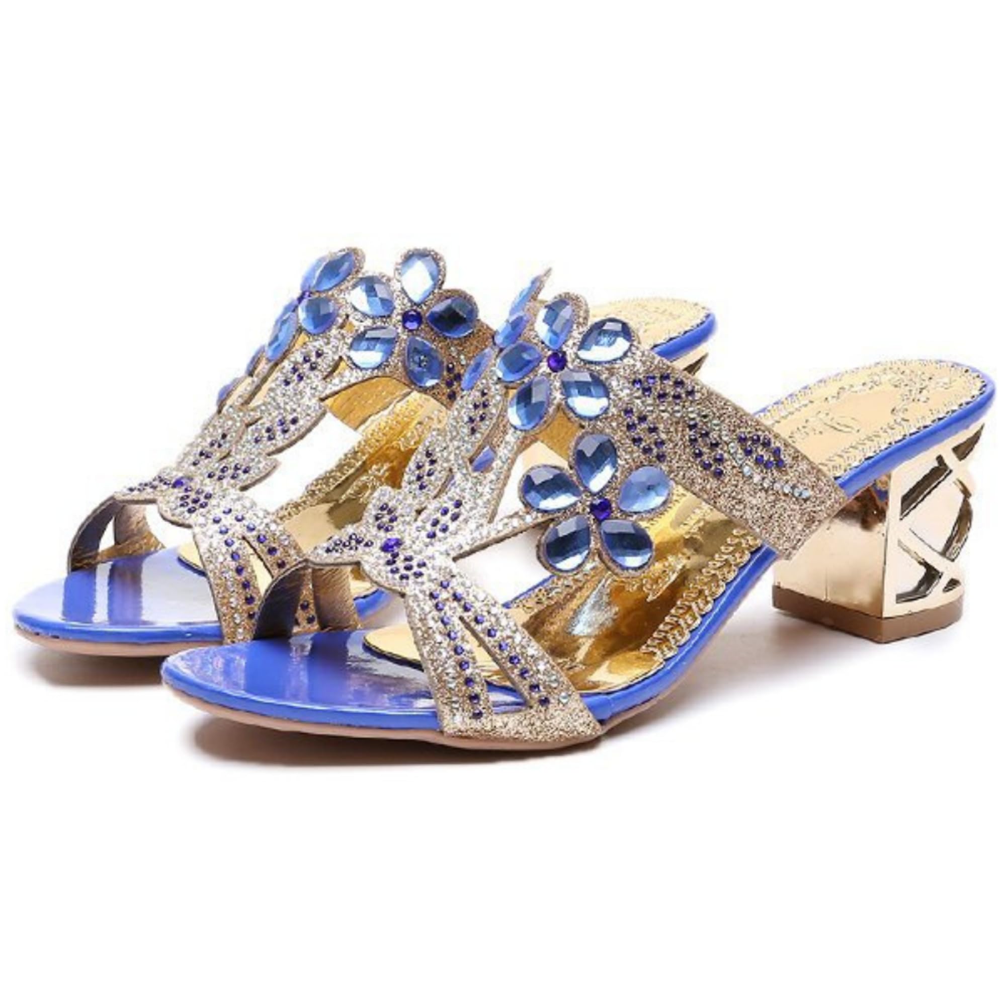 【送料無料】[ALVEIN] キラキラサンダル キラキラ サンダル レディース ビジュー ミュール チャンキーヒール ラインストーン ハイヒール 太ヒール フラワー ビーチ ゴールド 色:ロイヤルブルー、サイズ:24.0 cm