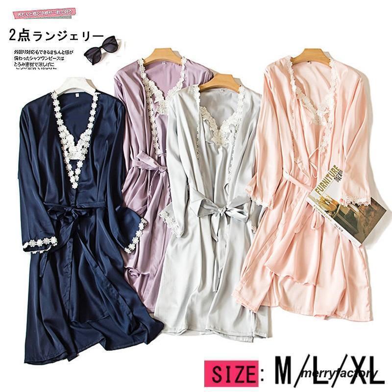 【スーパーセール限定】2点パジャマ ランジェリー レディース 前開き フェイクシルク ネグリジェ レース 春夏 長袖ガウン&キャミワンピ 部屋着 ランジェリー 大人オシャレ
