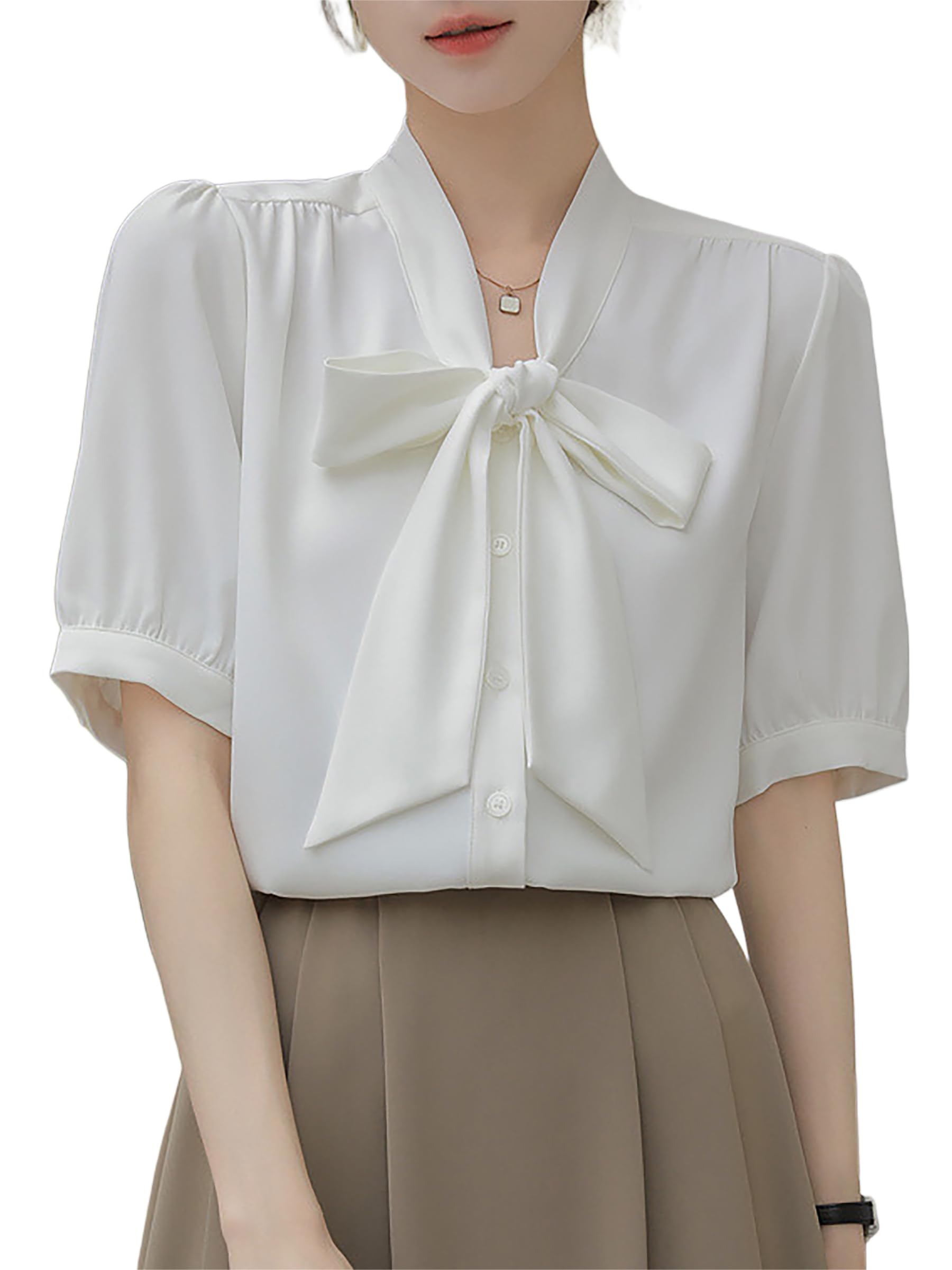 【送料無料】[Lalapala] ブラウス レディース 半袖 リボン シャツ ボウタイブラウス トップス 夏 ゆったり 大きいサイズ きれいめ 爽やか 無地 エレガント おしゃれ 着回し 着痩せ 体型カバー オフィス お出かけ デート 通勤 色:ホワイト、サイズ:L