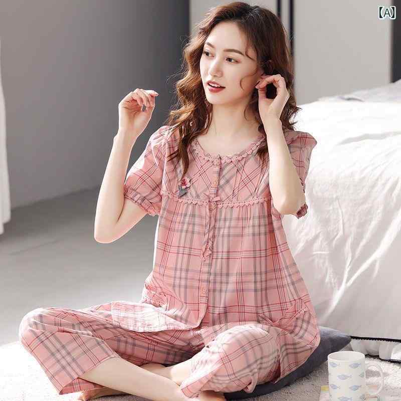 半袖 半ズボン パジャマ 女性用 綿 パジャマ 夏 薄手 チェック 柄 半袖 韓国 クロップドパンツ スーツ ゆったり 大きいサイズ 外出 着と して 家 しても 着用 可能