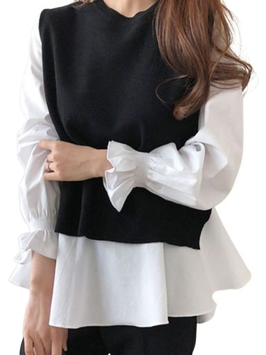 [AUSKY]上質ベストブラウス2点セットレディーストップス長袖丸首韓国ファッションストライプゆったりかわいいニット着瘦せバックスリットオフィスレイヤード風大人春秋お出かけ