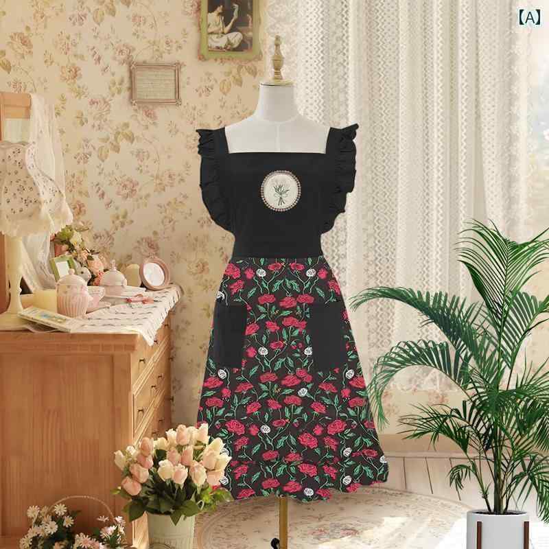 エプロン おしゃれ ママ 田園 風 エプロン ブラックローズ レース ウエスト バンド 家庭用 キッチン 調理 ベーキング 防汚 オーバー オール 作業着