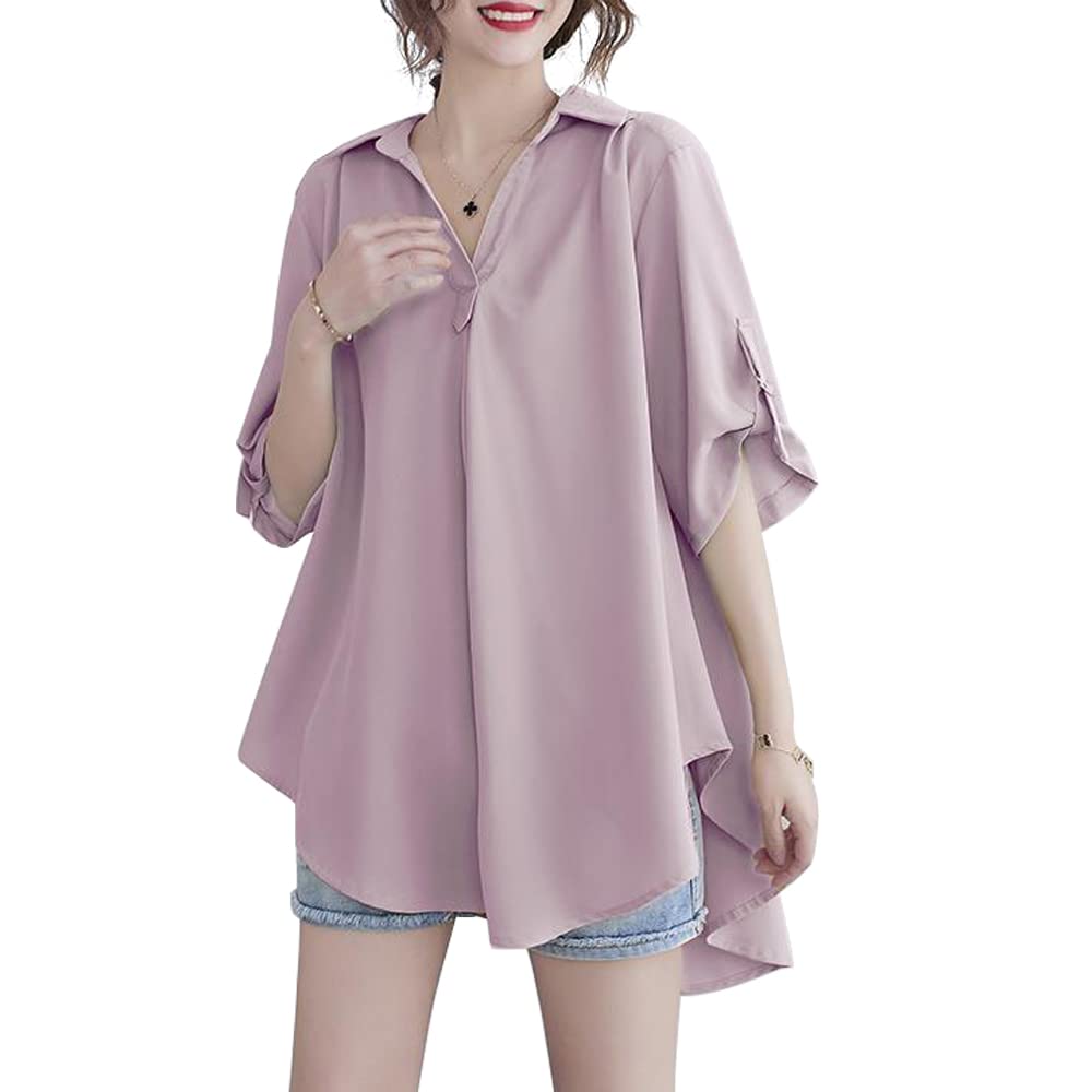 【送料無料】[ADKASS] シャツ レディース 半袖Vネック 夏 ゆったり オフィス 無地 五分袖 シフォン おしゃれ 大きいサイズ フォーマル シンプル 無地 通勤 OL カジュアル オフィス 色:ピンク、サイズ:Free Size