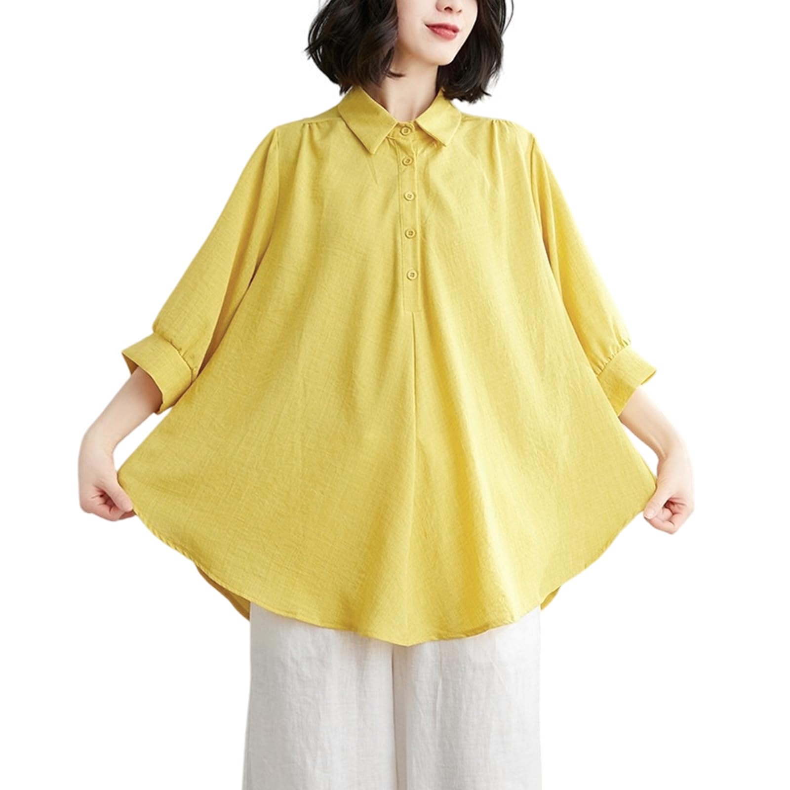 【送料無料】[F8eight] 綿麻専門店 シャツ リネン 上質 レディース 5分袖 襟付き ゆったり ボタン付き オフィス 無地 おしゃれ 大きいサイズ フォーマル シンプル 無地 着せ 万能アイテム 通勤 OL カジュアル オフィス 春 夏 秋 色:イエロー、サイズ:XL