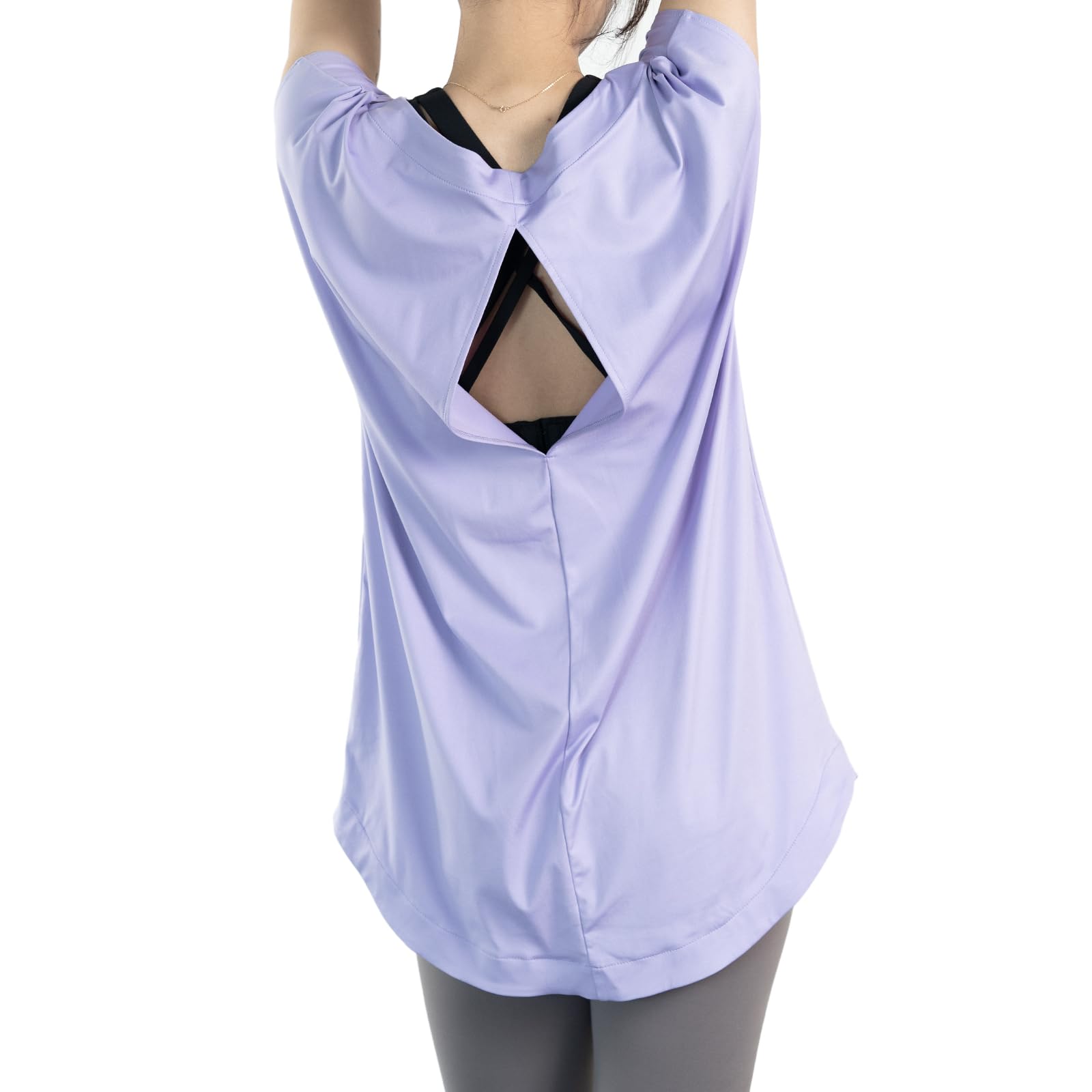 【送料無料】[iito.seasons] ヨガウェア レディース 美背中 背中開き ゆったり トップス 体型カバー 冷感シャツ ロング丈 丈長 半袖 スポーツ ルームウェア フィットネス トレーニング 吸汗速乾 UVカット 紫外線対策 薄手 夏 おしゃれ 色:バイオレット、サイズ:L
