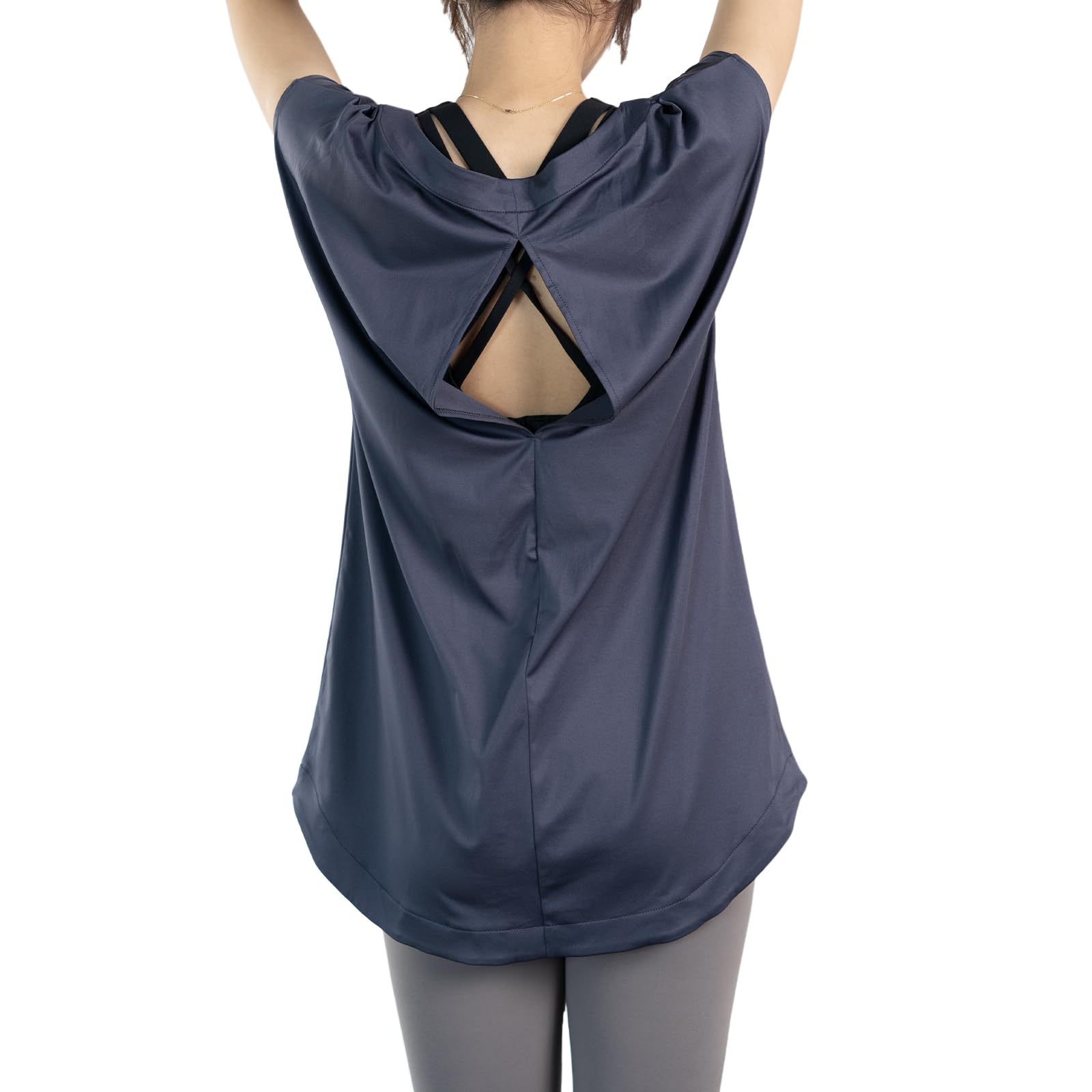 【送料無料】[Cenote Rico] 【美背中スタイル】 ヨガウェア 体型カバー 着やせ レディース トップス 半袖 ロング丈 吸汗速乾 ピラティス ホットヨガ [サラサラ生地が心地良い] [ほめられウェア] 色:ダークグレー、サイズ:M