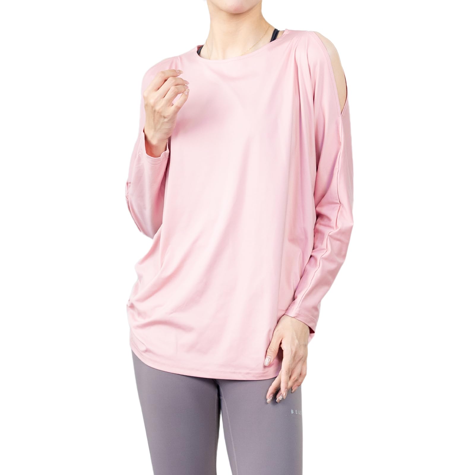 【送料無料】[iito.seasons] ヨガウェア レディース トップス 丈長め 長袖 オープンショルダー ドルマンスリーブ ゆったり フィットネスウェア 体型カバー ロング丈 冷感シャツ 薄手 吸汗 速乾 UVカット 紫外線対策 おしゃれ 人気 色:ピンク、サイズ:M