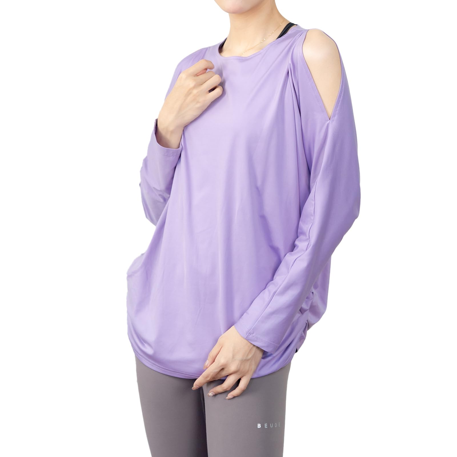 【送料無料】[iito.seasons] ヨガウェア レディース トップス 丈長め 長袖 オープンショルダー ドルマンスリーブ ゆったり フィットネスウェア 体型カバー ロング丈 冷感シャツ 薄手 吸汗 速乾 UVカット 紫外線対策 おしゃれ 人気 色:バイオレット、サイズ:L