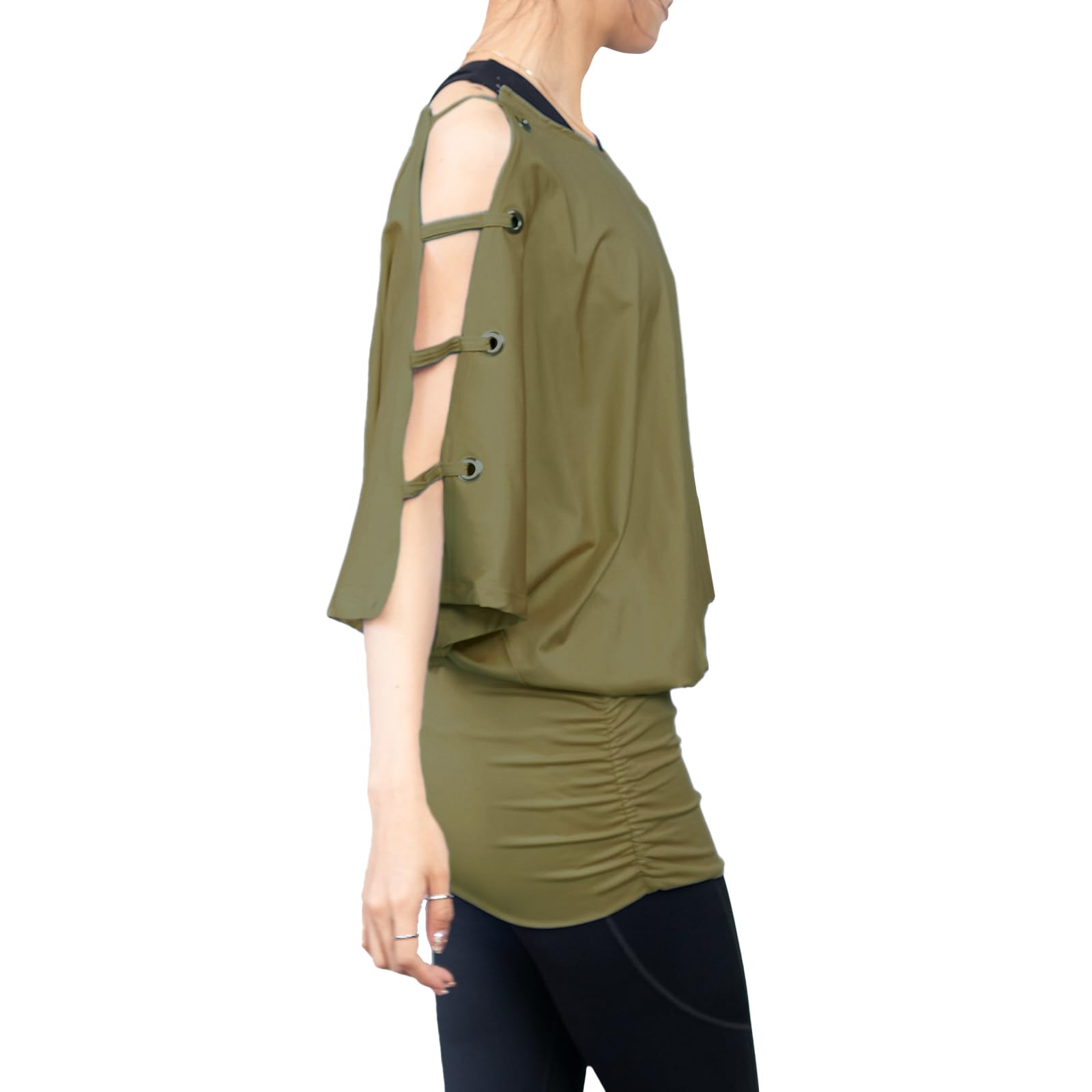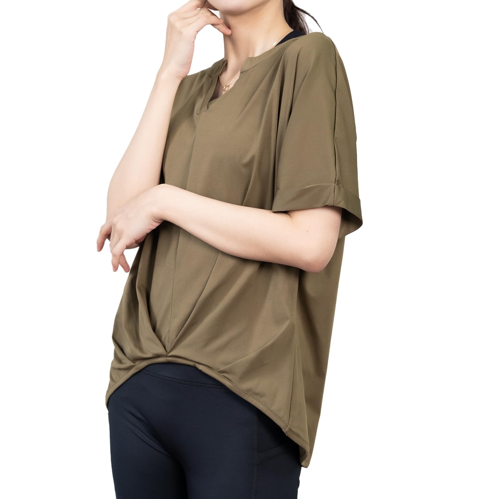 【送料無料】[iito.seasons] ヨガウェア レディース 丈長め ゆったり オープンショルダー 体型カバー フィットネス 半袖 フィットネス 吸汗速乾 UVカット 紫外線対策 薄手 夏 おしゃれ 色:モスグリーン、サイズ:S