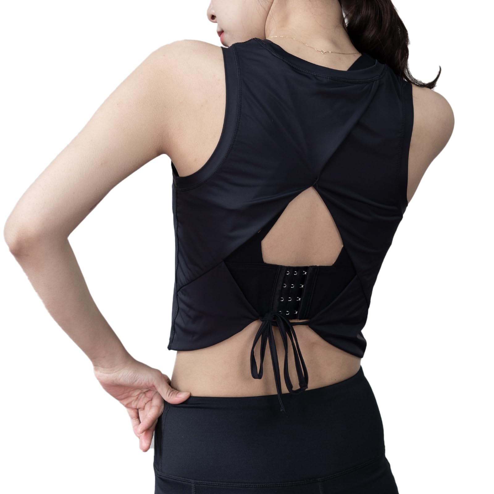 【送料無料】[iito.seasons] タンクトップ ショート丈 レディース ノースリーブ スポーツウェア ヨガウェア へそ出し 背中 通気 防臭 吸汗 速乾 ダンス トレーニング フィットネスクシャツ 色:ブラック、サイズ:XL