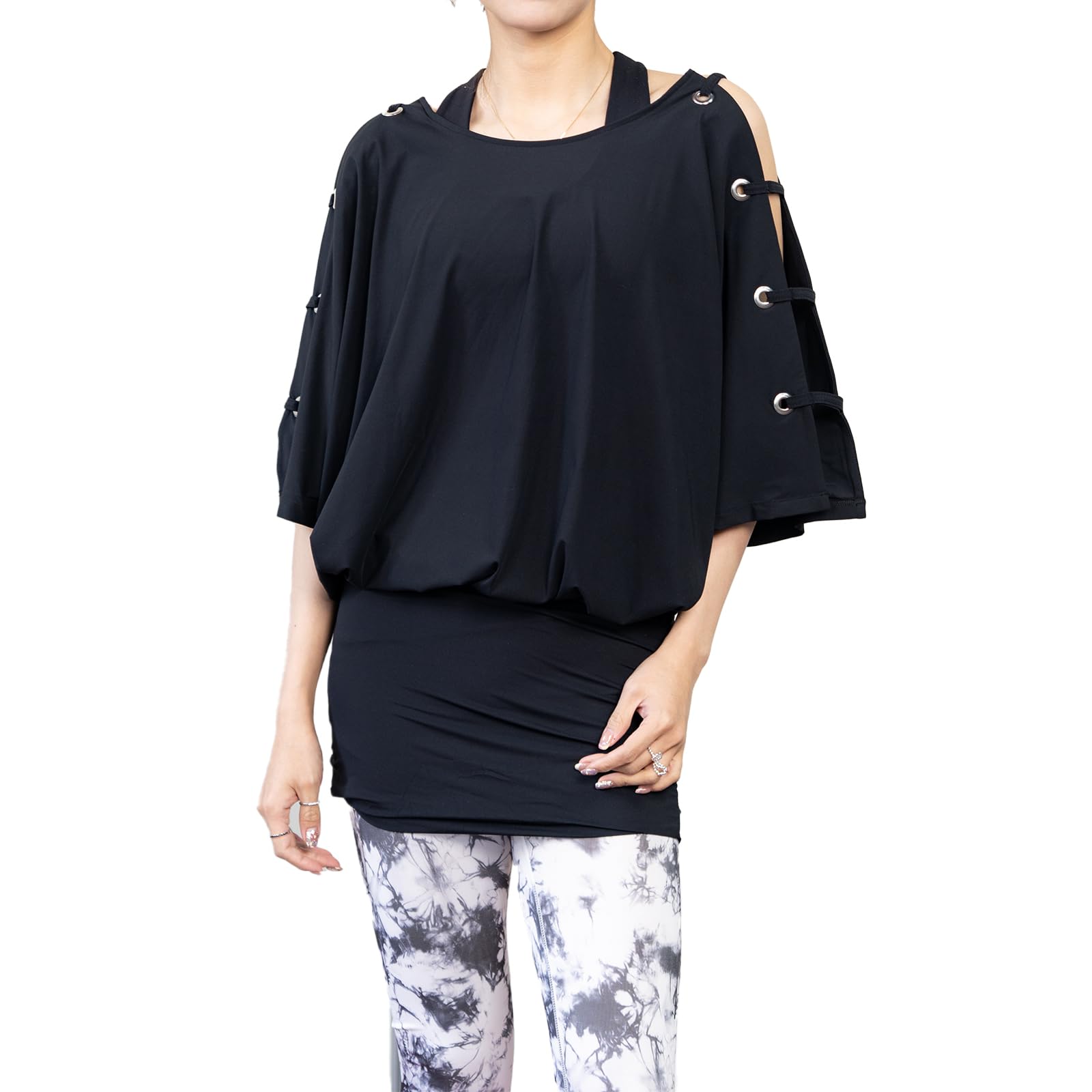【送料無料】[iito.seasons] ヨガウェア レディース 丈長め ゆったり オープンショルダー 体型カバー フィットネス 半袖 フィットネス 吸汗速乾 UVカット 紫外線対策 薄手 夏 おしゃれ 色:ブラック、サイズ:L