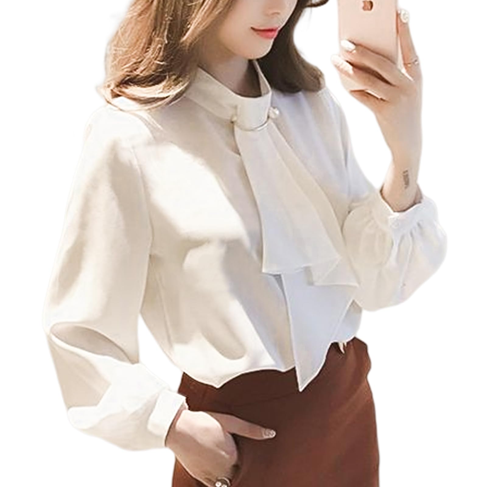 【送料無料】[Tiernyueth] 長袖シャツ ブラウス レディース Vネック トップス リボン付き爽やか おしゃれ オフィス カジュアル シフォン 着痩せ 体型カバー ゆったり パフスリーブ おしゃれ ボウタイ エレガント デート 春夏秋 色:ホワイト、サイズ:M