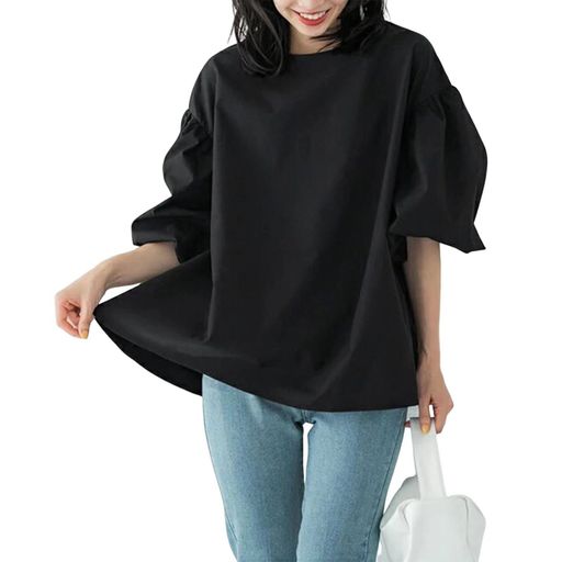 [MEMEXTRA]メメエクストラブラウスレディース七分袖夏春半袖tシャツパフスリーブトップス無地かわいいカットソーカジュアル夏服オフィスおしゃれ大きいサイズゆったりシャツ丸襟襟なし…