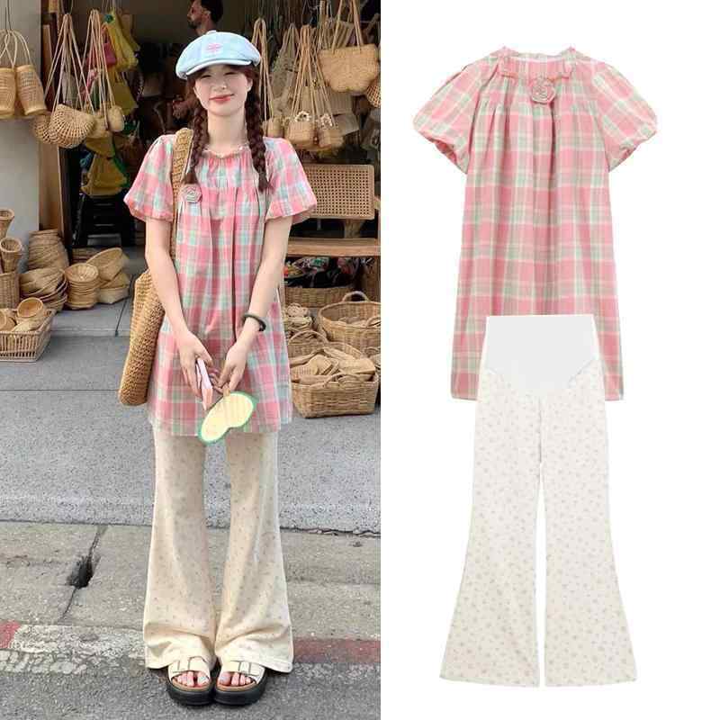 マタニティワンピース マタニティウエア マタニティ服 マタニティ スーツ 夏 コットン& リネン チェック 柄 パフスリーブ 薄手 9 ポイント フレア お腹 引き締め パンツ ツーピース トップ ドレス