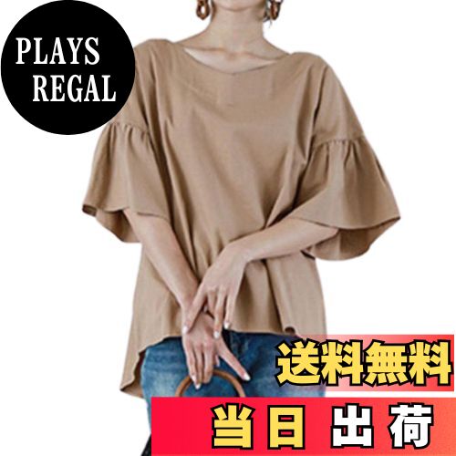 【送料無料】[MEME XTRA] メメエクストラ ブラウス レディース 半袖 夏 春 Vネック 半袖tシャツ フリル フレア トップス カットソー 夏服 オフィス おしゃれ 大きいサイズ 五分袖 ゆったり 快適 シャツ 襟なし 無地 かわいい キレイめ 通勤 上品 色:キャメル、サイズ:L