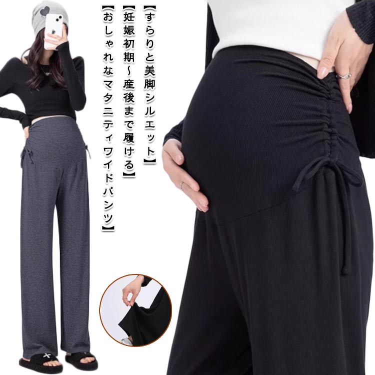送料無料 マタニティ パンツ マタニティワイドパンツ サイドドローストリング アジャスター 通勤