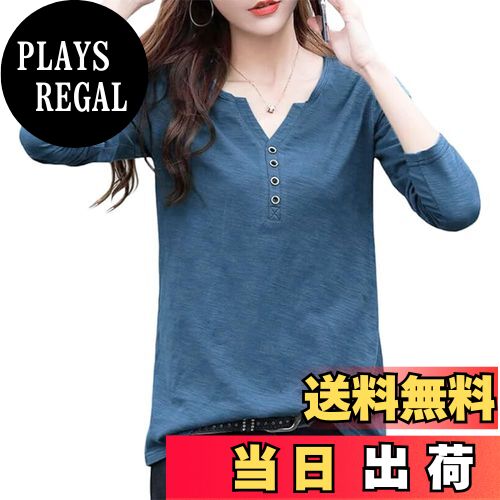 【送料無料】MUISHUYU tシャツ レディース vネック 長袖 春 綿 無地 カットソー おしゃれ 大きいサイズ トップス YU01 色:ブルー、サイズ:L