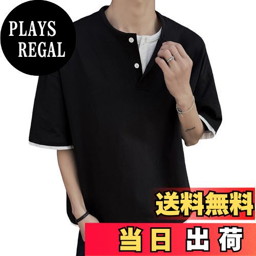【送料無料】[ANONIE] tシャツ メンズ 半袖 ヘンリーネック 無地 カジュアル 夏服 メンズ フェイク レイヤード風 カットソー おしゃれ ゆったり トップス おおきいサイズ(ブラック、グレー)M-XXXL 色:ブラック、サイズ:XL