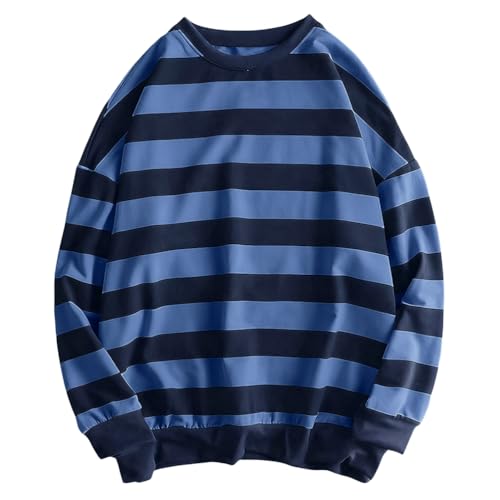 【送料無料】[Minesam] ボーダー パーカー メンズ トレーナー ロングT 長袖 プルオーバー Tシャツ ボーダー柄 カットソー ビッグt オーバーサイズ カジュアル 大きいサイズ 色:ブルー、サイズ:XL