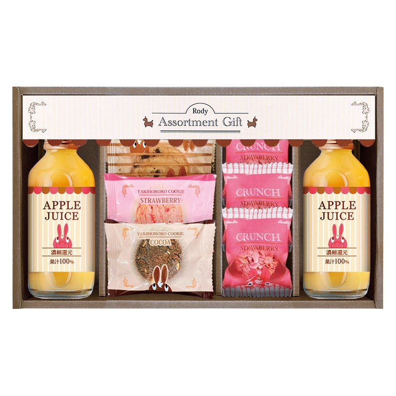 国産りんごを使用した、濃縮還元果汁100%のほどよい酸味でスッキリとした味わいのりんごジュースに、ココアクッキー・イチゴクッキーや、ざっくりクッキーなどを詰合せました。