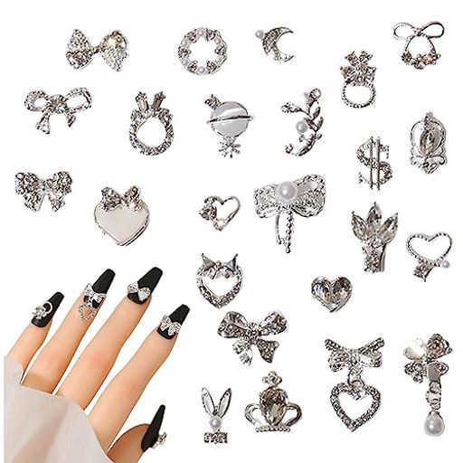 ネイルパーツリボンハート24個セット3D立体大きめネイルパーツストーンキラキラネイルアートジュエリーパーツ揺れるシルバーメタルパーツDIY手芸デコパーツ(シルバー)