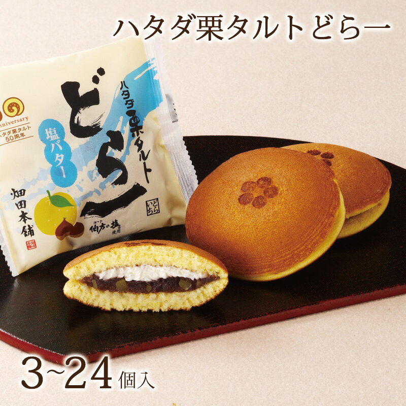 「ハタダ栗タルト」の“ゆず風味の栗入りこし餡”を、「どら一」の塩バターと合わせ、ふわふわのどら焼き生地でやさしくはさみました。