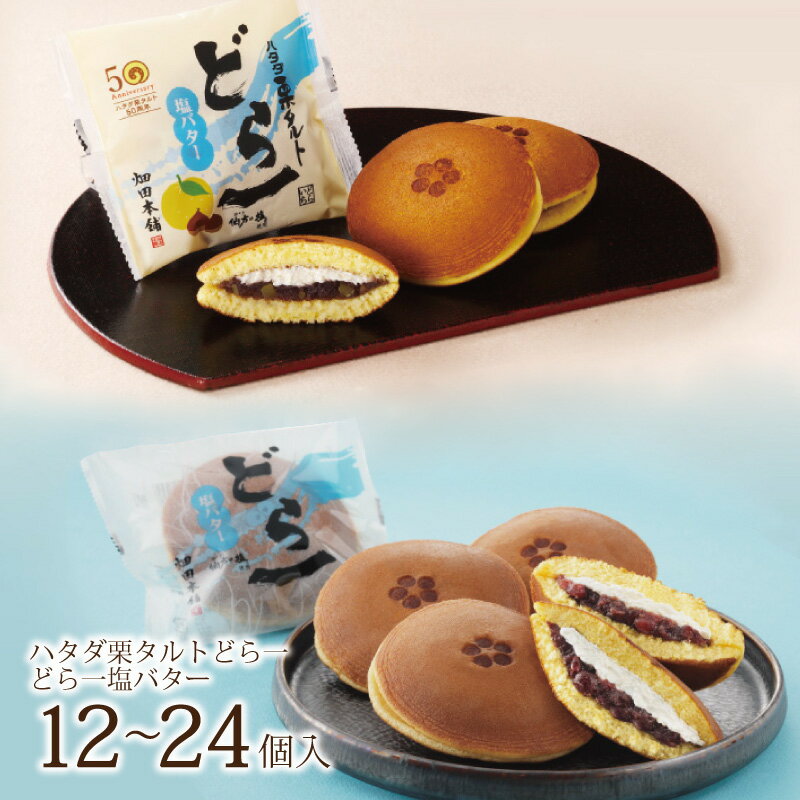 「ハタダ栗タルト」の“ゆず風味の栗入りこし餡”を、「どら一」の塩バターと合わせ、ふわふわのどら焼き生地でやさしくはさみました。