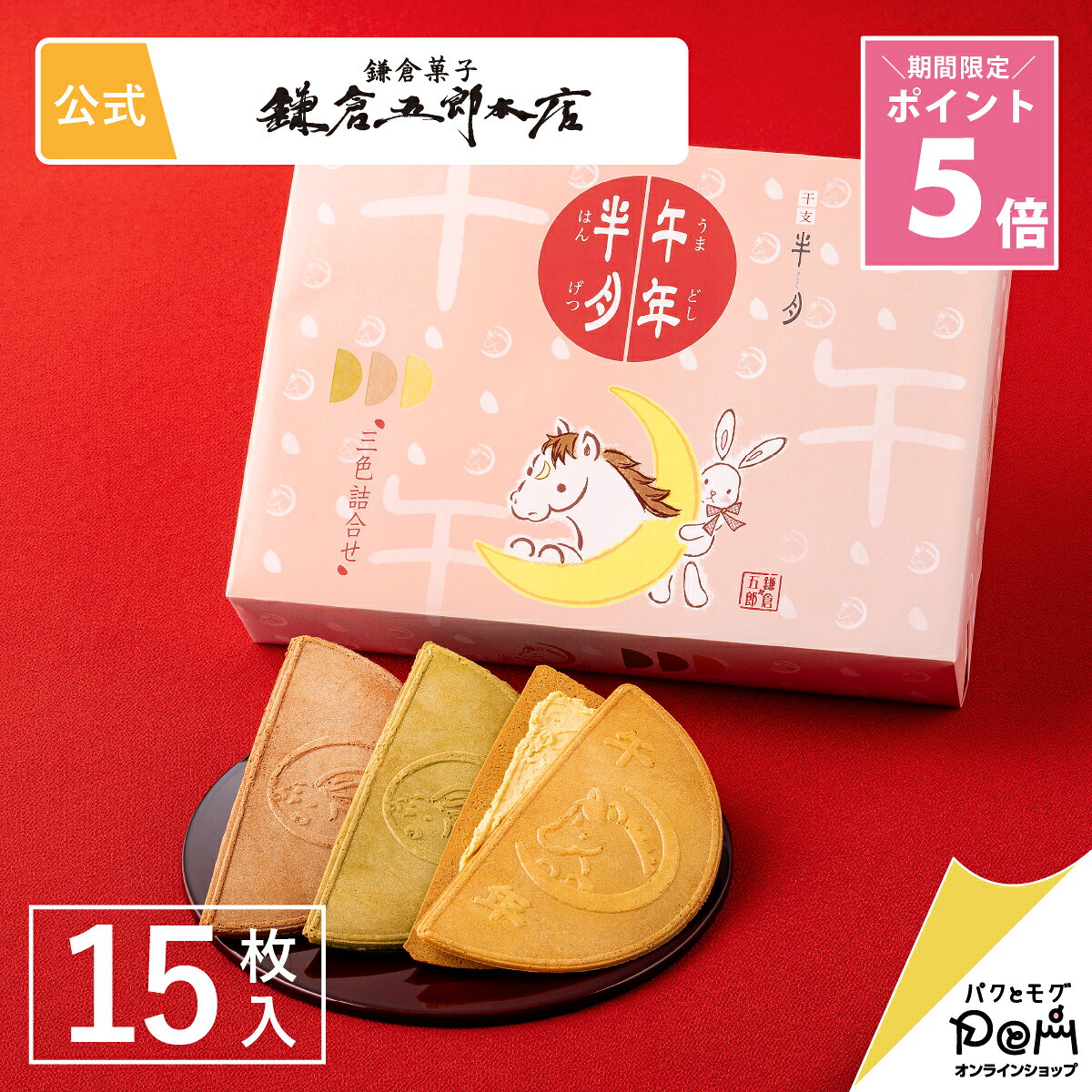 新春だけのおめでたい鎌倉半月菓子折り お土産 お年始 年始 帰省 実家 縁起がいい 栗きんとん 抹茶 あずき あんこ 年末年始 おかし 家族 半月 鎌倉五郎 包装紙 御年賀 開運 干支