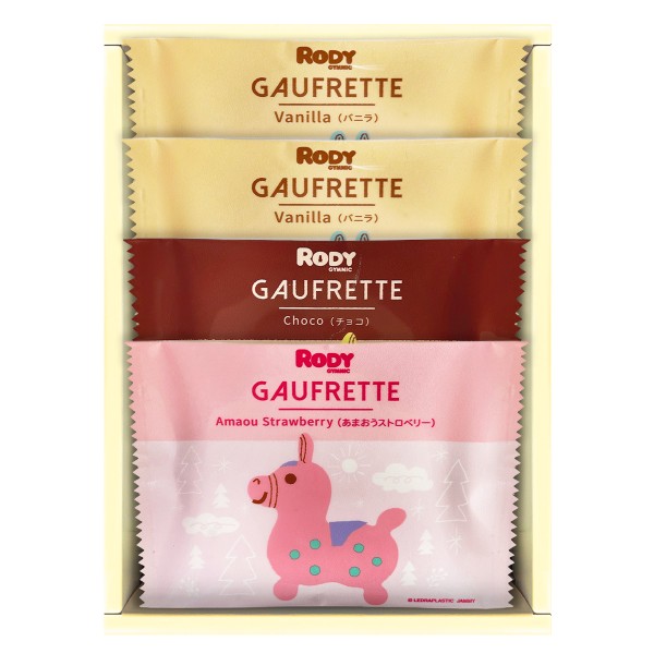 あまおう苺に、チョコとバニラの3種類のゴーフレットをかわいいロディでお届けします。