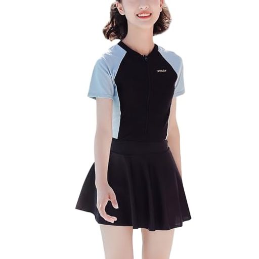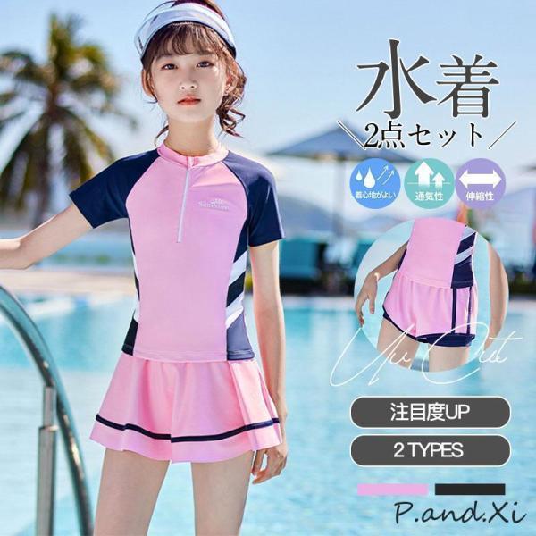 【スーパーSALE限定】キッズ 水着 女の子 ジュニア フィットネス水着 ラッシュガード セパレート スカート 2点セット 半袖 レディース 水遊び プール 海 体型カバー