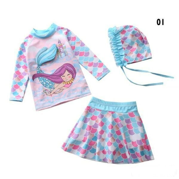 【スーパーSALE限定】キッズ 水着 女の子 セパレート 子供 ジュニア 女児用 スイムウェア 3点セット 小学生 長袖ラッシュガード スカート スイムキャップ付き