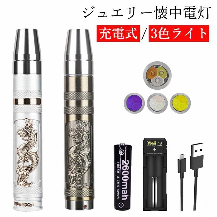 LEDライト 龍 ドラゴン ホワイト ゴールド 3色 小型 3種類 ハンディライト 懐中電灯 宝石 ジュエリー 鑑定 おすすめ リチウムイオン充電池 18650マーク 365NM紫外線ランプ 白色光 黄色光