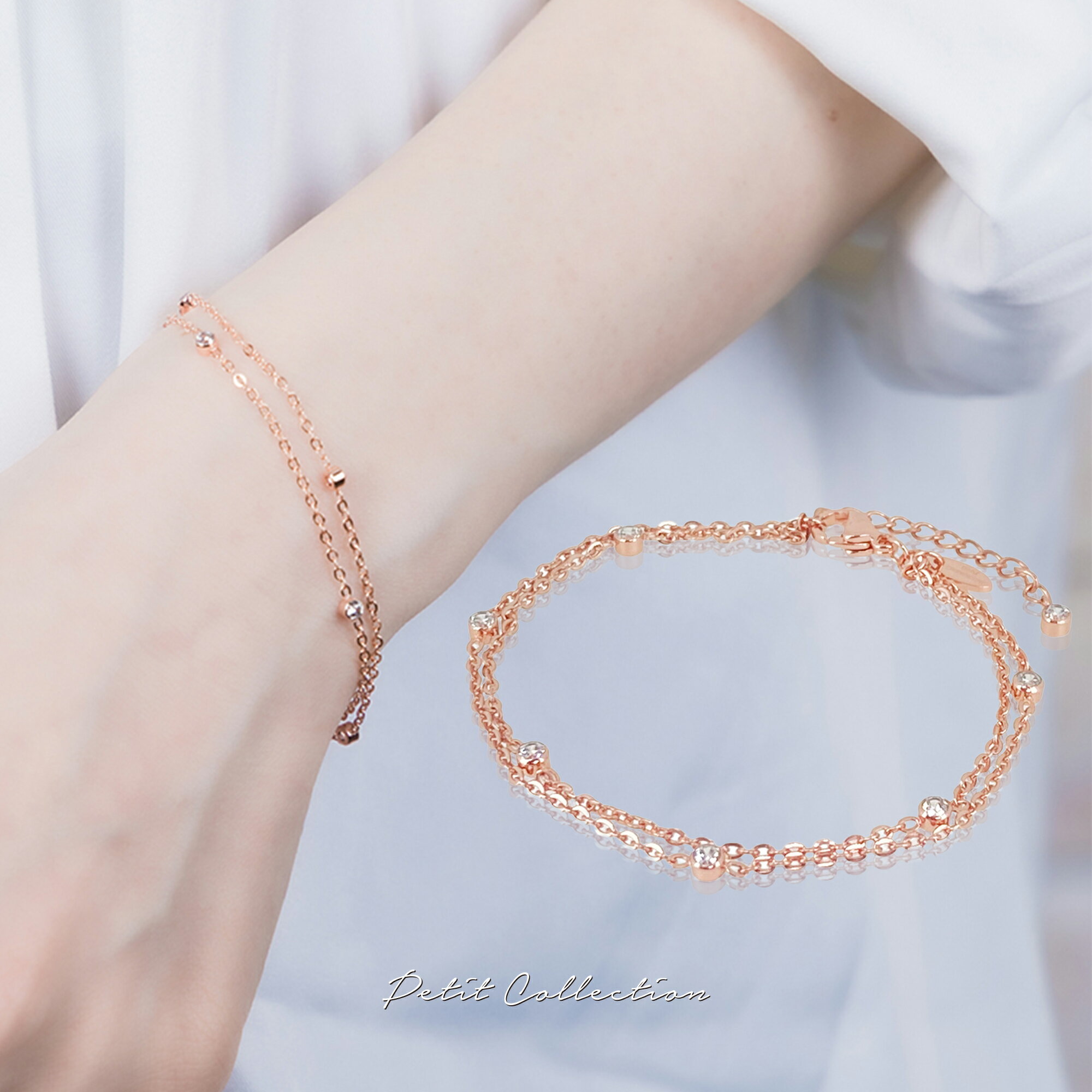 ブレスレット ステンレス製 レディース 金属アレルギー サージカルステンレス ゴールド シルバー キュービックジルコニア チェーン 2連