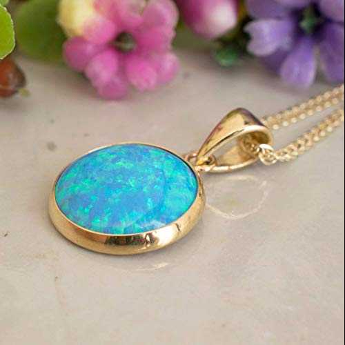 14K ゴールド ブルーオパール ネックレス - 14K ソリッド イエロー ゴールド 上品なペンダント 10 月の誕生石付き、シンプルな 12mm ラージサイズ ラウンド オパール ジェムストーン - 上品な女性のための繊細なハンドメイド ジュエリー Adita Gold 14