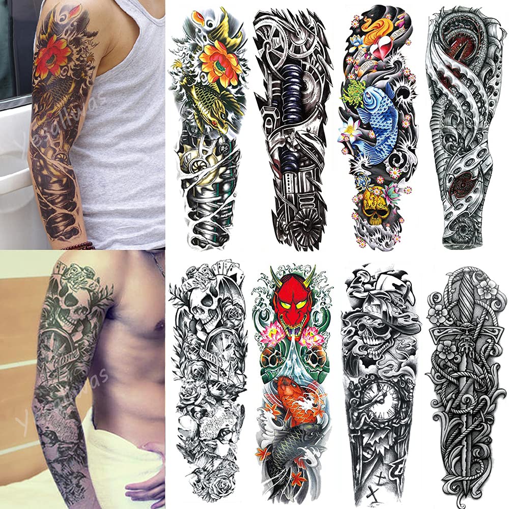 【送料無料】Yesallwas タトゥーシール 大型 特長 肩から手首 8枚セット鯉 蓮の花 和柄 入れ墨 リアル 大判 防水 長持ち 和彫り 刺青シール ボディー メンズ full arm tattoo 17x48CM (A)