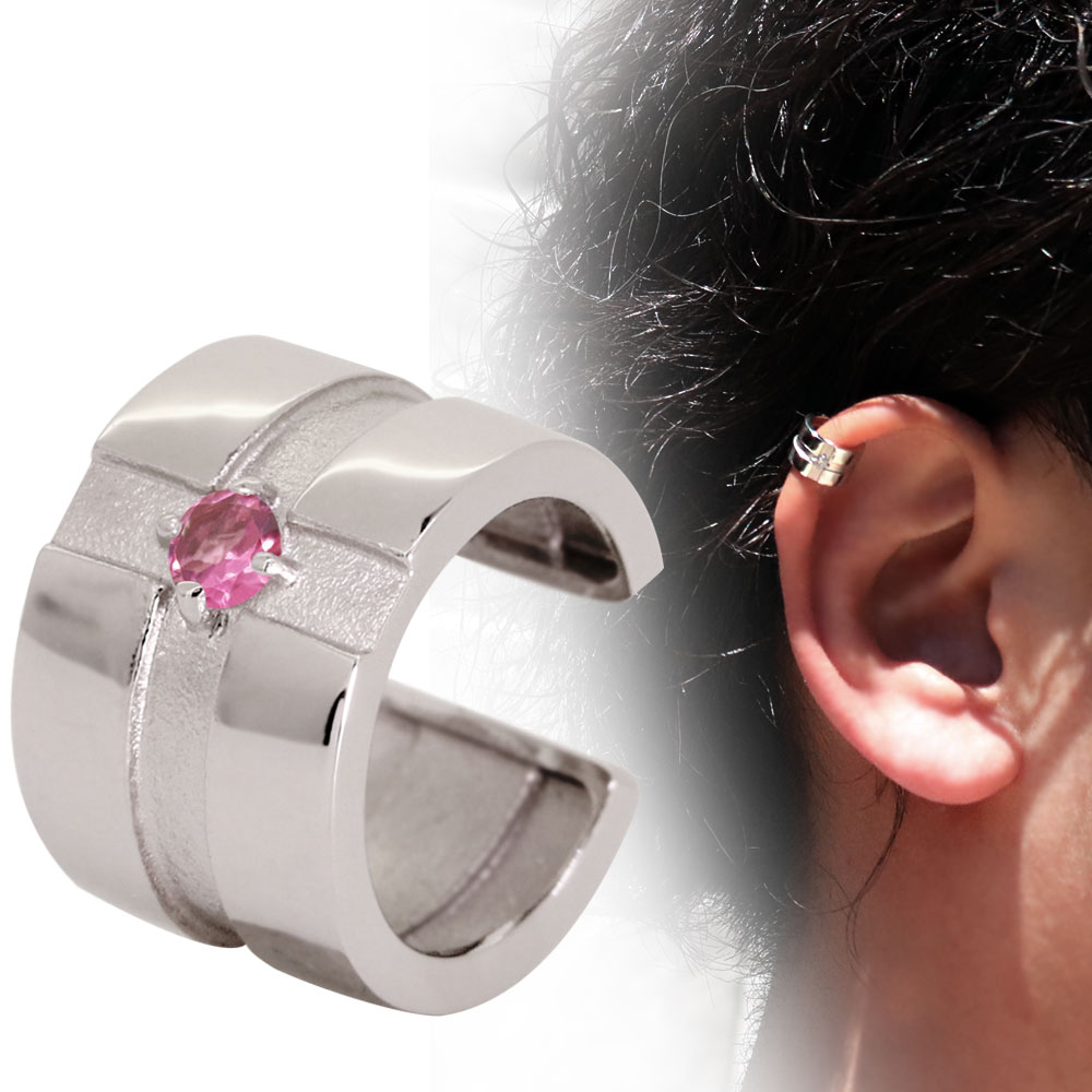 送料無料 イヤーカフ メンズ プラチナ ピンクトルマリン クロス イヤカフ 重ね付け 軟骨 痛くない かっこいい 十字架 ノンホールピアス