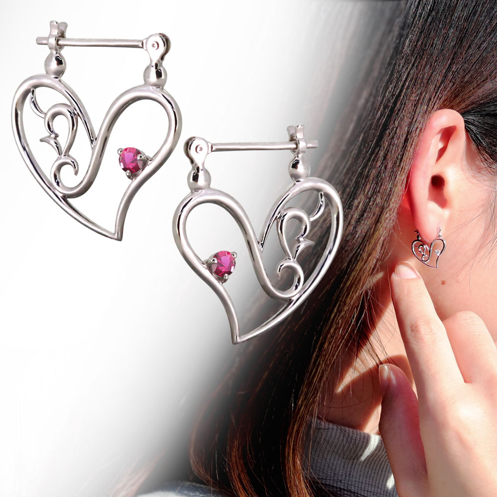 送料無料 ピアス レディース キャッチレス フープピアス ハート ルビー 誕生石 7月 クロッシングピアス 女性 人気 可愛い 大人 記念日 誕生日