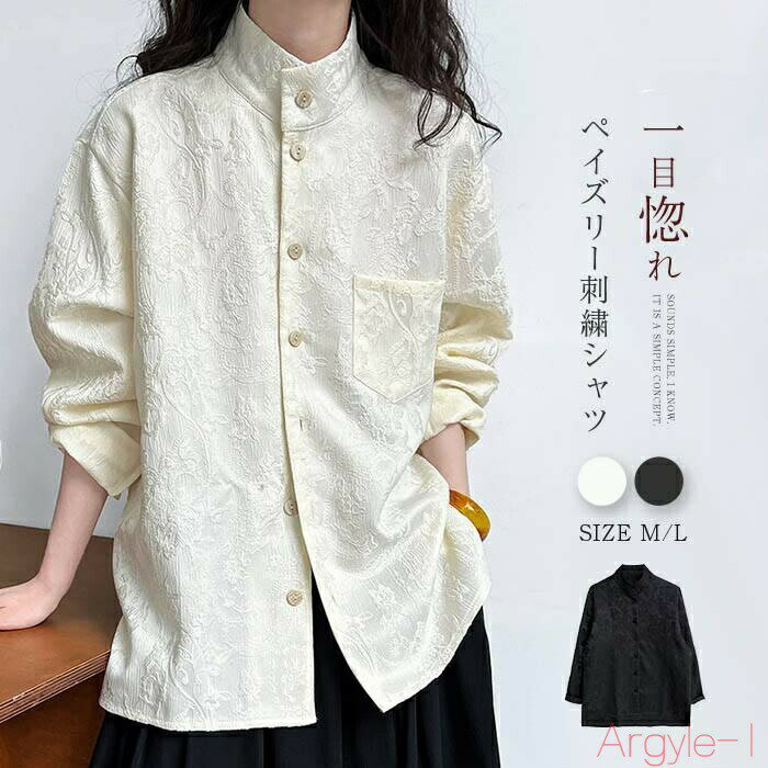 ペイズリー刺繍シャツ 長袖 花柄 スタンドカラー シャツ ブラウ