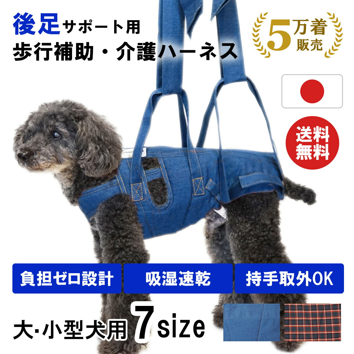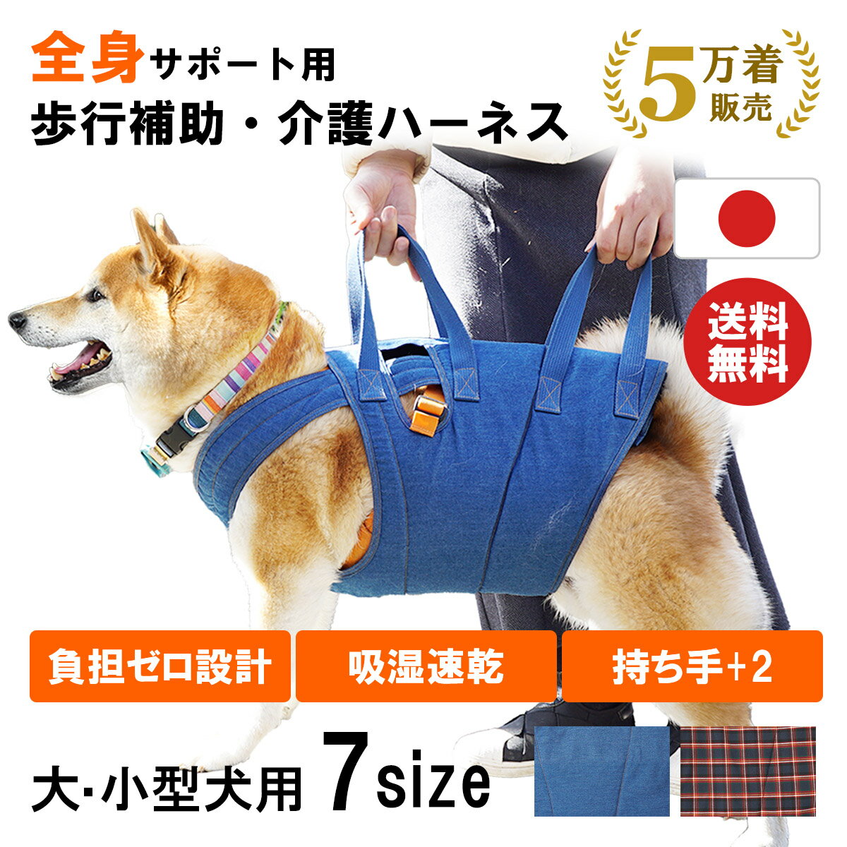 シニア犬 ハーネス 国内縫製の犬の介護用ハーネス 持ち手1+後足サポートタイプ カラー素材は綿紺色チェック柄と 国産デニムブルーの2種類