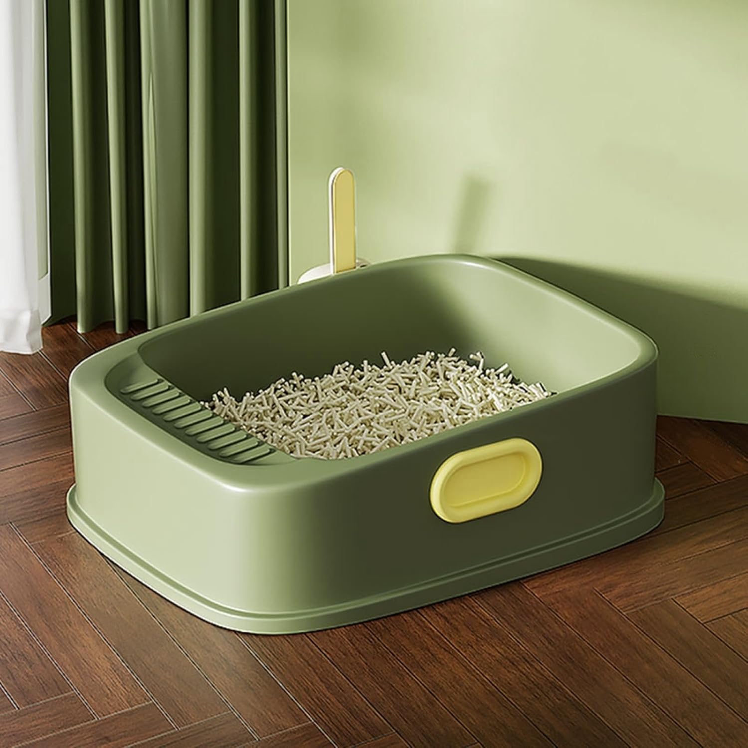 猫用トイレ本体 オープンタイプ 緑色 51×43×19cm 子猫 成猫 ネコトイレ ハーフカバー 飛び散らない 足に砂残らない 可愛い おしゃれ 清潔 抗菌 快適 スコップ付き 掃除しやすい システム