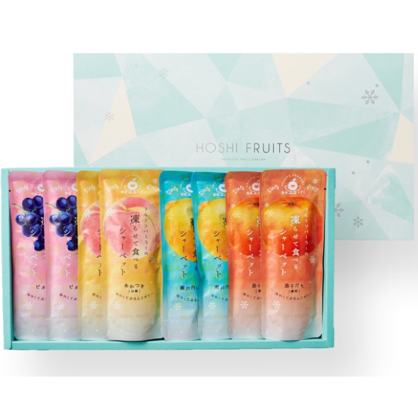島そだち・瀬戸内レモン・福島のあかつき(白桃)・ピオーネと、日本の豊かな気候で育った国産フルーツ果汁を使用した贅沢なジュレを凍らせて食べるシャーベット。