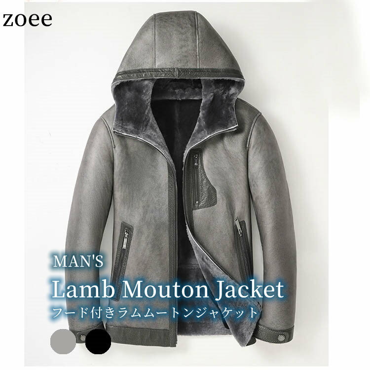 Wフェイス ラムムートンジャケット フード付き ラムレザー ファー天然ムートン メンズ 秋冬 アウター ショート丈 グレー ブラック L/2L/3L/4L/5L j4a10