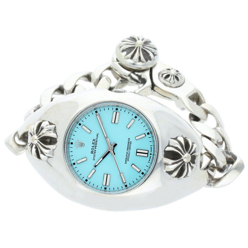 クロムハーツ Chrome Hearts ×ロレックス ROLEX サイズ:41mm Ref.124300 オイスターパーペチュアル CHXモチーフクラシックリンクウォッチケース腕時計(シルバー×ライトブルー 230.54g)【818052】【SS07】【小物】【中古】bb462#rinkan*A