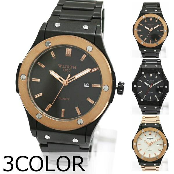 太めで存在感のあるベゼルデザイン カレンダー シンプル文字盤 メタルベルト クオーツ WSQ019 メンズ腕時計