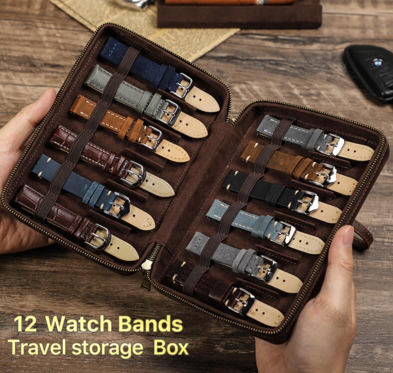 高品質本革使用の12本用腕時計ベルト収納ケース 持ち運びやすくコンパクトでコレクションの整理に便利なメンズ向け収納ボックス